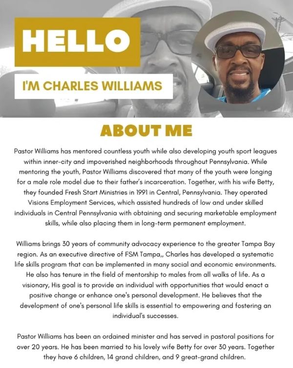 Fresh Start Ministries of Tampa Inc. is a non-profit 501(c)(3) organization founded by Pastors Charles and Betty Williams, who bring over four decades of spiritual and social counseling experience to those impacted by the criminal justice system. Fresh Start was founded on the belief that anyone can be transformed and rehabilitated by the power and love of our Savior and Lord, Jesus Christ. No one is beyond redemption. Through their 3-prong approach to ministry, they have touched and transformed the lives of thousands of incarcerated men and women.